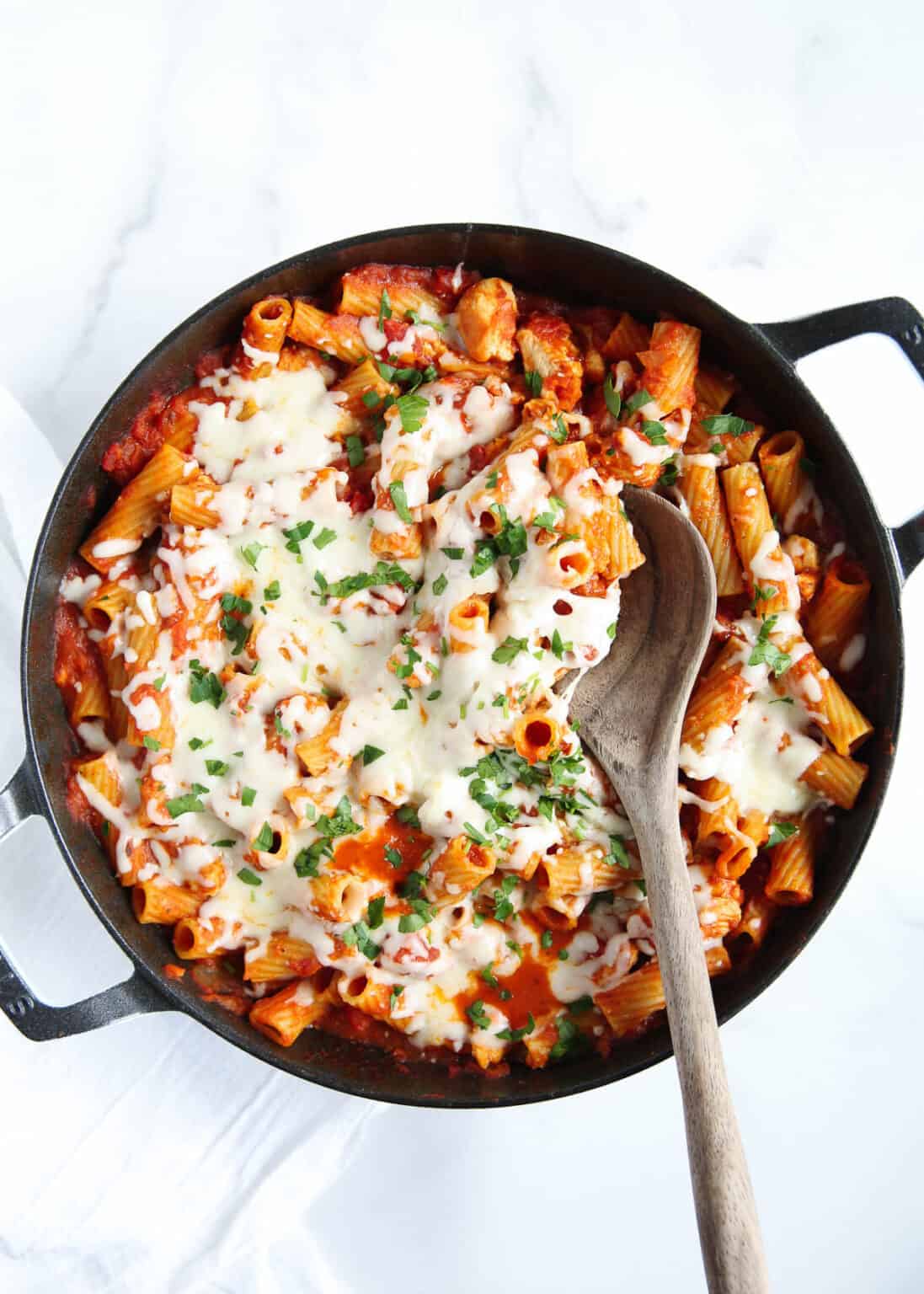 This one-skillet lasagna combines Italian sausage, onion, garlic, and lasagna noodles all cooked up in marinara sauce and topped with ricotta cheese and mozzarella cheese.