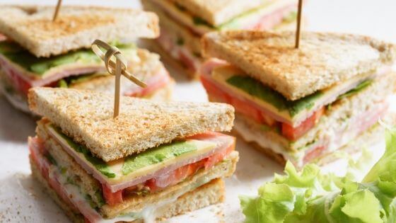 Club sandwiches are a hearty lunch option and so easy to assemble. Just toast 3 slices of bread, add mayo, ham, cheese, lettuce, tomato, and bacon.
